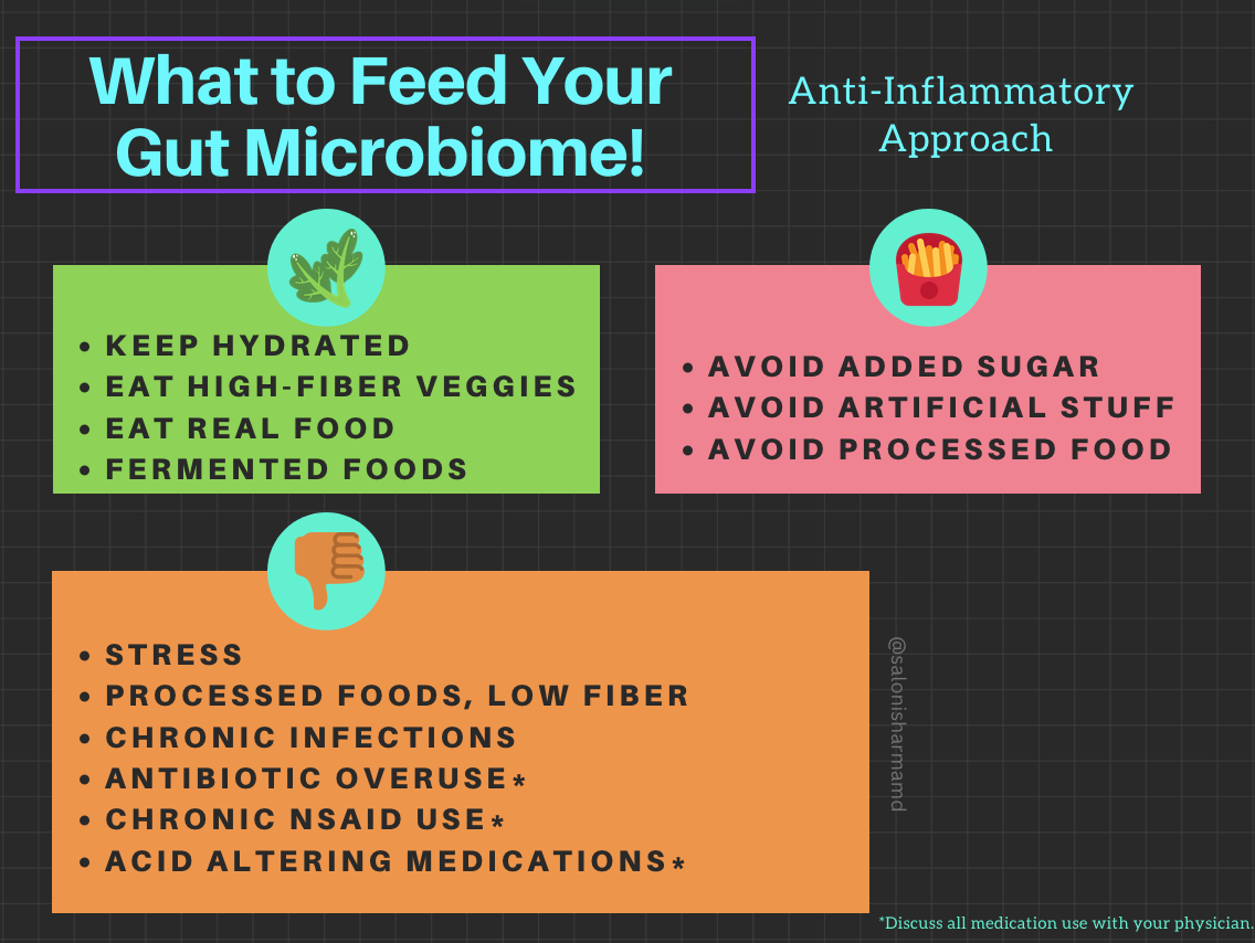 The bottom line is to focus on vegetables, high-fiber fruits, unprocessed foods, and fermented foods for a balanced microbiome.